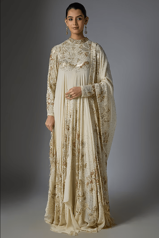 Featuring an almond asymmetrical kurta in chiffon base with sequins embroidery. it is paired with pants dupatta. Accentuate with statement jewellery and heels for a wedding ceremony or festive occasions.