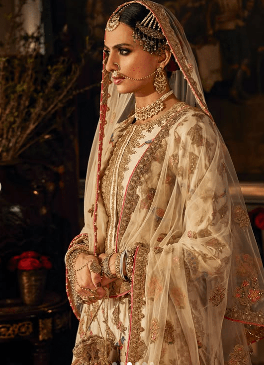 An ivory silk kurti-sharara. It features floral and avian motifs gleaned from Mughal miniature art and archival textile fragments. The look is completed with an embroidered tulle dupatta.