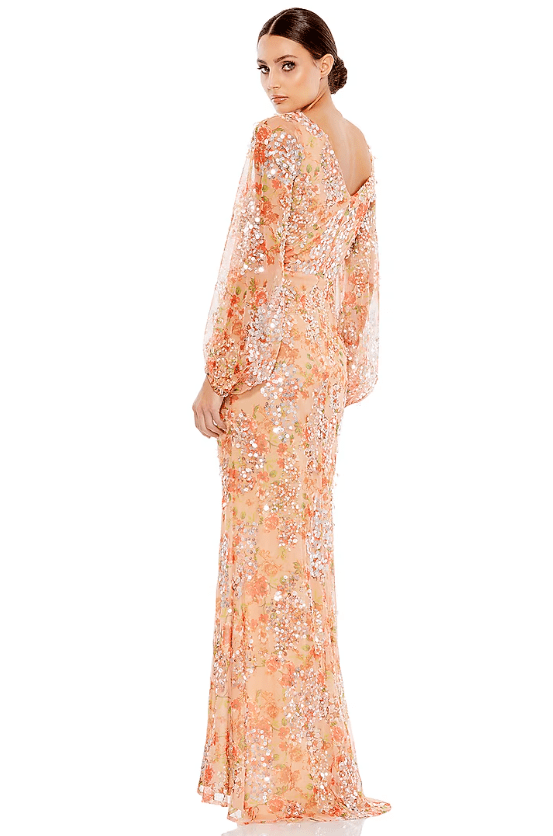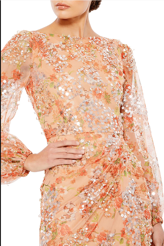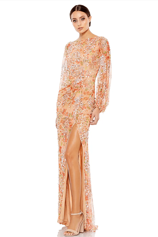 Featuring an apricot gown in polyester base with balloon sleeves, thigh-high slit, floral print and embellishments. Accentuate it with statement earrings and heels for evening wear or cocktail party.