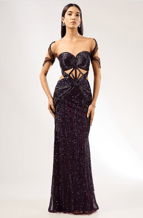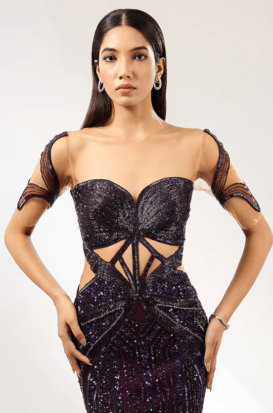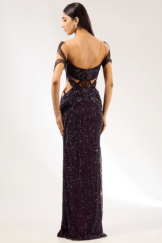 Featuring an aubergine gown in italian tulle and silk lycra base with glass beads and sequins hand embroidery, including attached sleeves. Accentuate it with statement earrings and heels for cocktail parties.