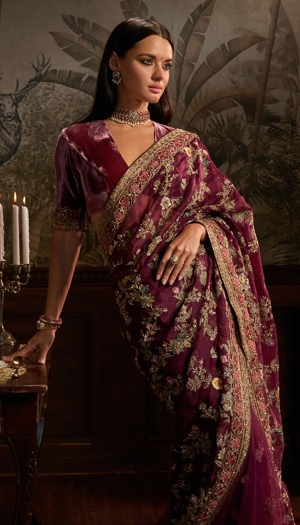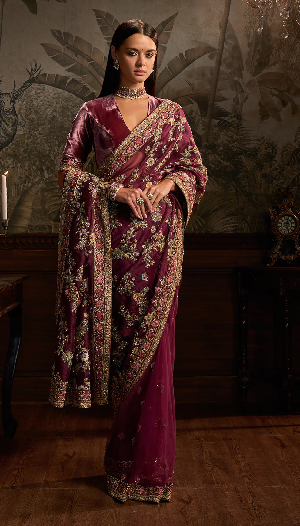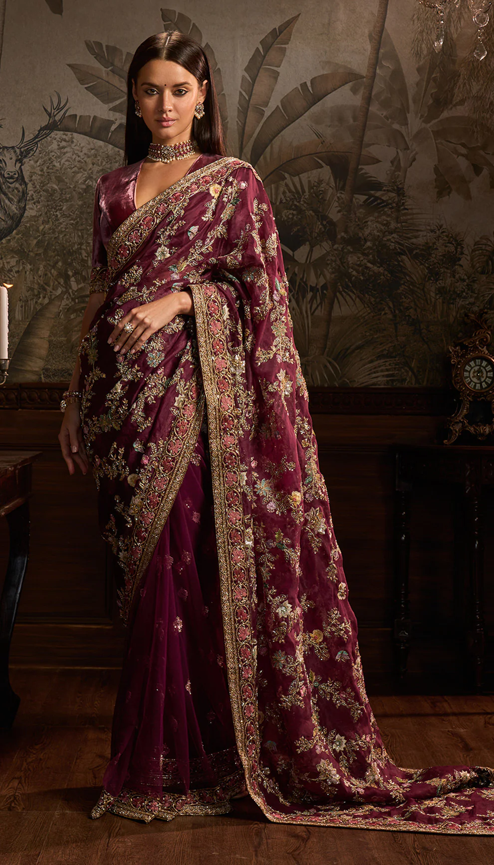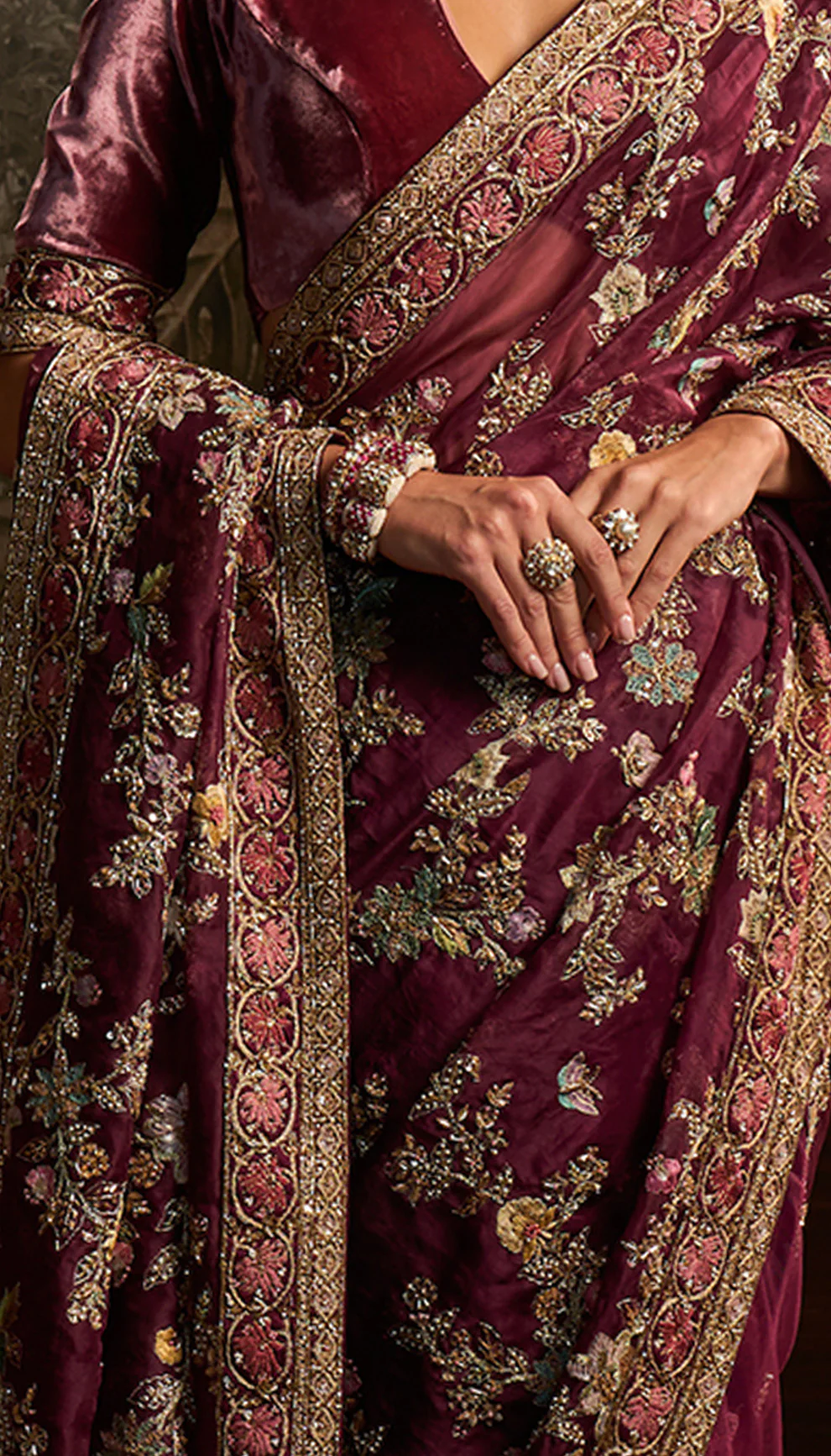 An aubergine silk organza sari with intricate aari and peeta embroidery. This is teamed with a velvet blouse.