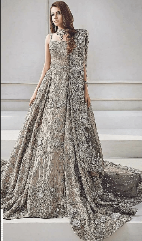 Beautiful heavy maxi lahnga in brownish silver color in Stylish design emblazoned with Dabka, Naqshi, Crystal Work. Bridal lehnga is presented with long froke shirt and looking so unique.