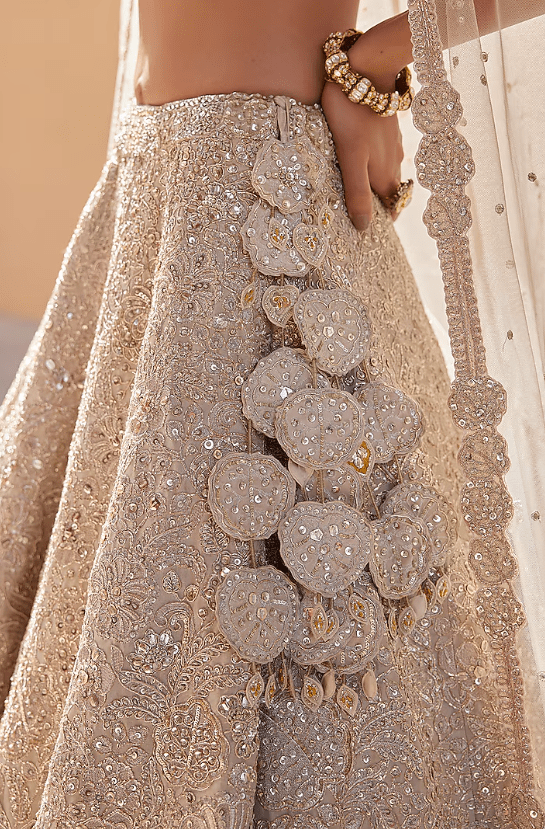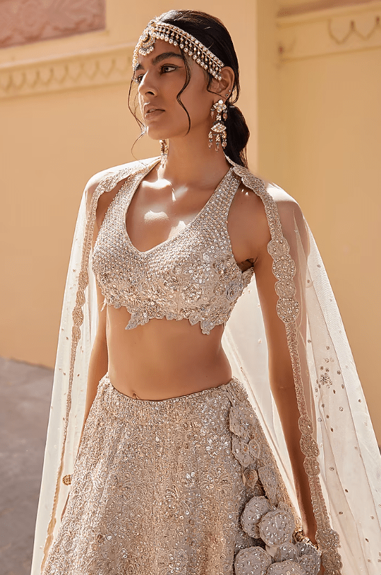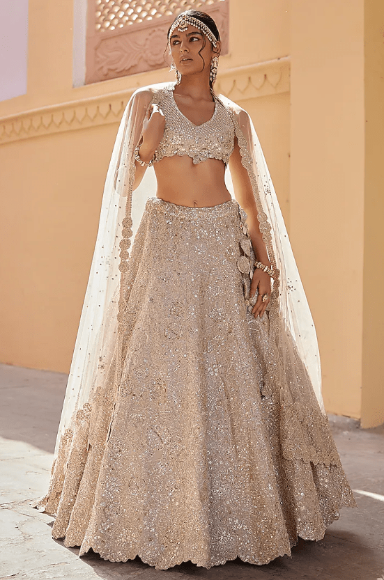a beige champagne handcrafted lehenga in tissue silk base with zardosi, french knots, aari and 3D floral embroidery. It is paired with a blouse and a dupatta. Accentuate it with statement earrings and heels for weddings or sangeet ceremonies.