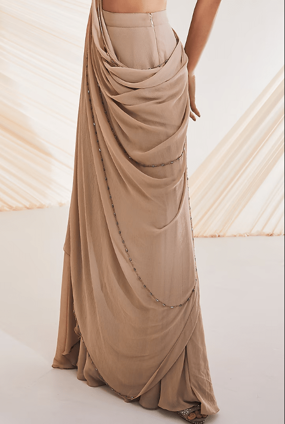 Featuring a beige saree in chiffon base with beads detailing. It is paired with a matching hand embellished blouse having gota details. Perfect wear for festive occasions or wedding ceremonies.