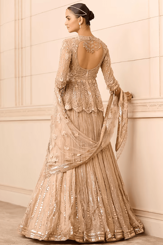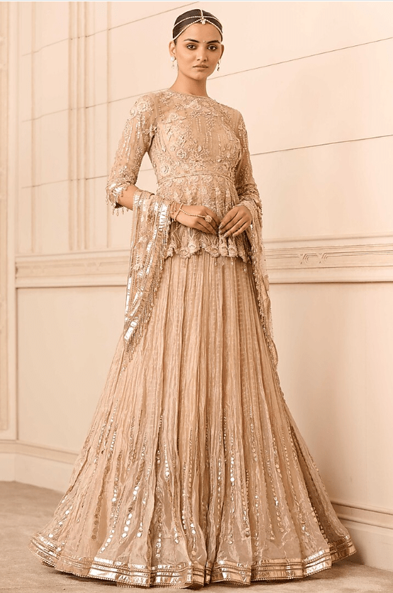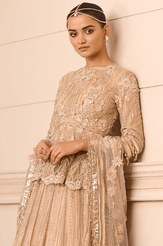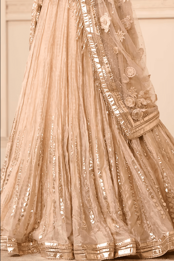 Featuring a beige lehenga in crinkled base with gota embroidery. It is paired with a matching floral embroidered silk tissue peplum and a tulle scarf.