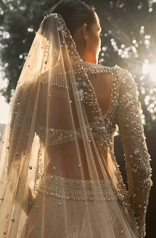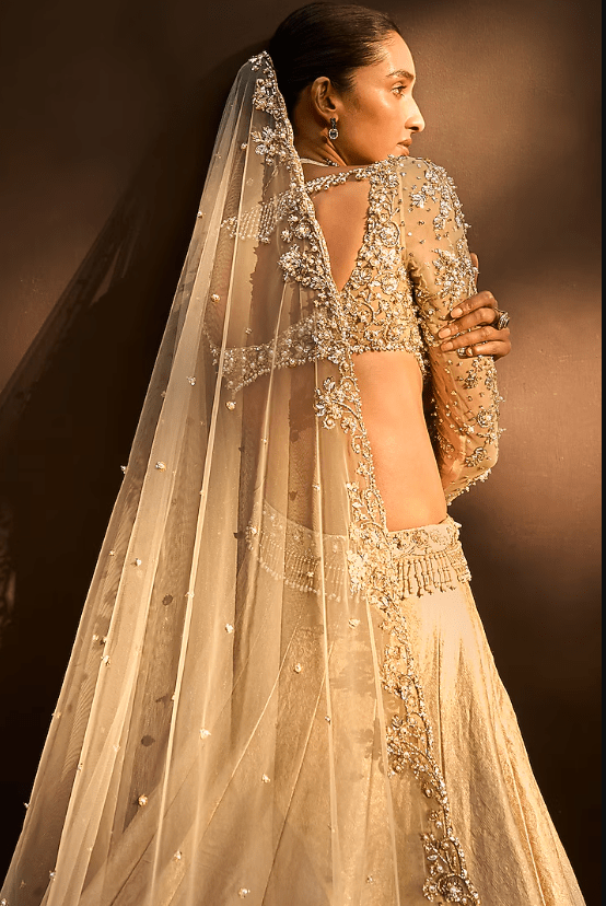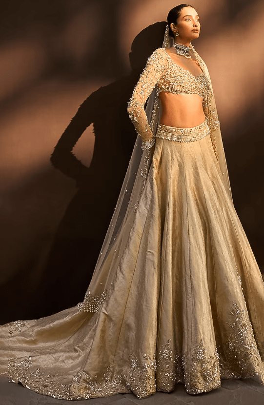 Featuring a beige gold lehenga in brocade silk base with pearls, sequins, cutdana, salli, badla and zari embroidery. It is paired with an embroidered choli and an embroidered dupatta. Accentuate the designer lehenga with zirconia or swarovski jewellery, embellished heels and a potli bag for a bridal look, Perfect wear for your wedding or engagement ceremony