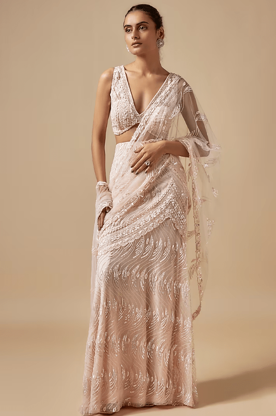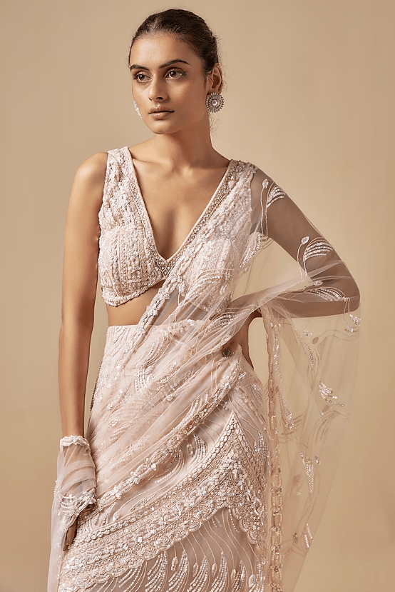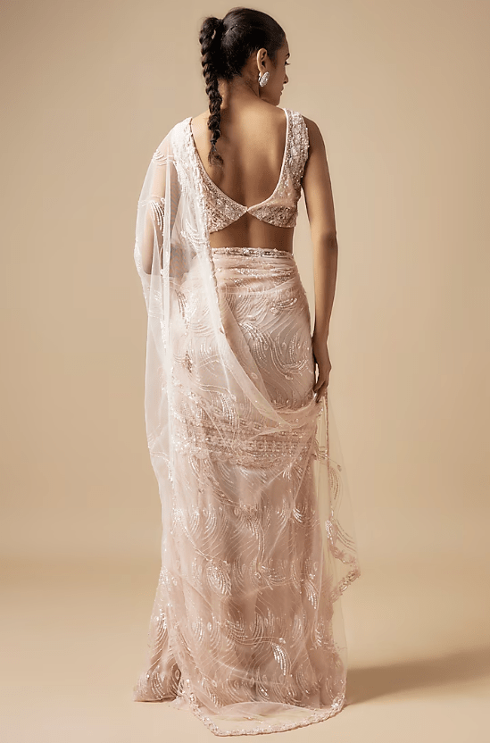 Featuring a beige draped saree in net base with cutdana hand embellishments. It is paired with an embellished blouse. Accentuate it with minimal jewellery and heels for a sangeet or engagement ceremony.