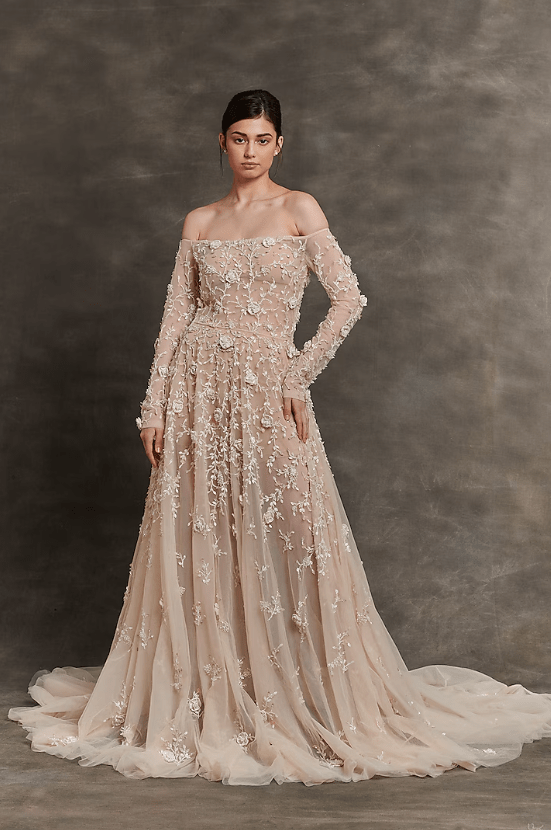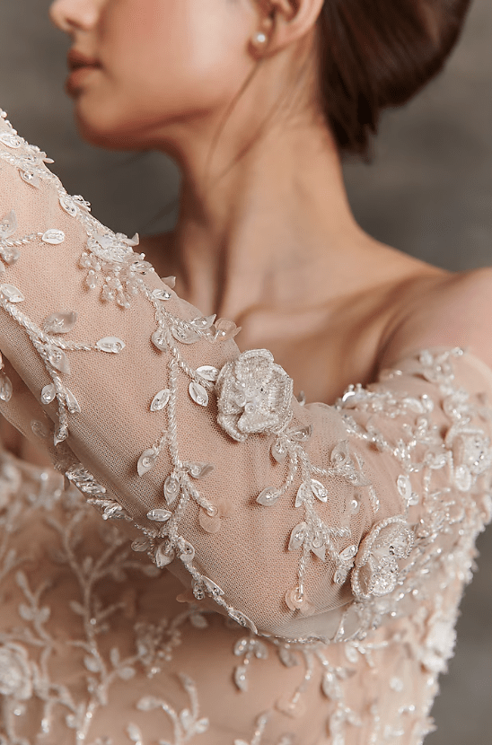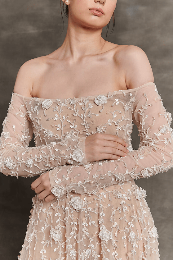 Beige Net & Sheer Embroidered Off-Shoulder Gown