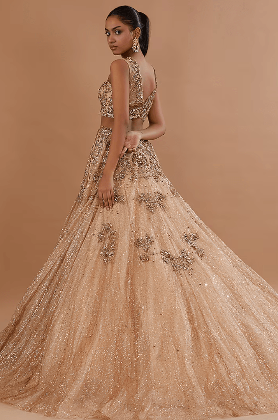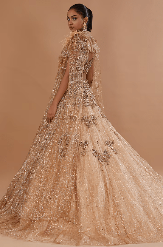 Featuring a beige lehenga in shimmer organza base. It is paired with a blouse, tulle ruffled cape and a can-can. Accentuate this statement lehenga set with heels and dangler earrings for a wedding, sangeet or engagement ceremony.