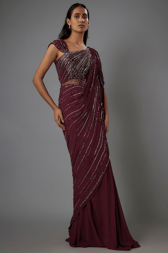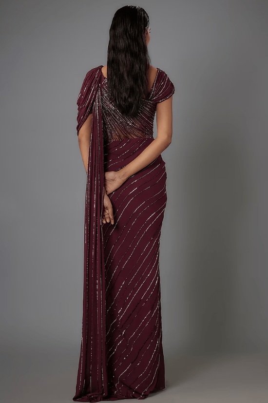 Featuring a berry gown saree in georgette base with bugle bead embroidery and cowl drape detailing. Accentuate it with statement jewellery and heels for festive occasions or wedding ceremonies.
