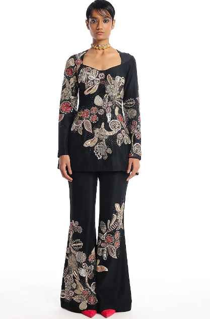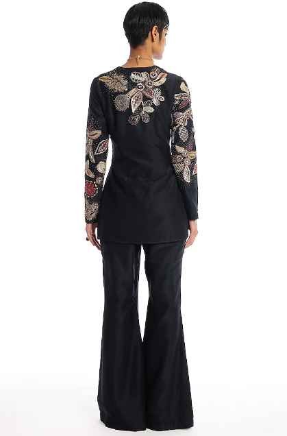 Featuring a black kurta in chanderi silk base with applique embellishment. It is paired with pants. Accentuate it with statement earrings and heels for a wedding or festive occasion