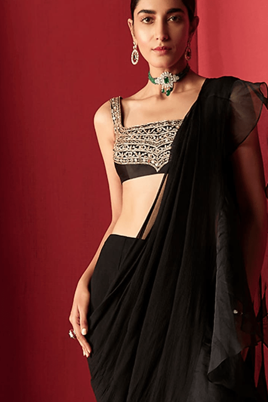Featuring a black draped saree in chiffon and organza base with embroidery. It is paired with a matching blouse in chanderi base.