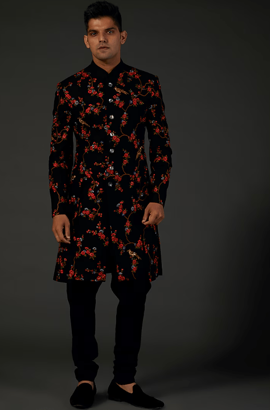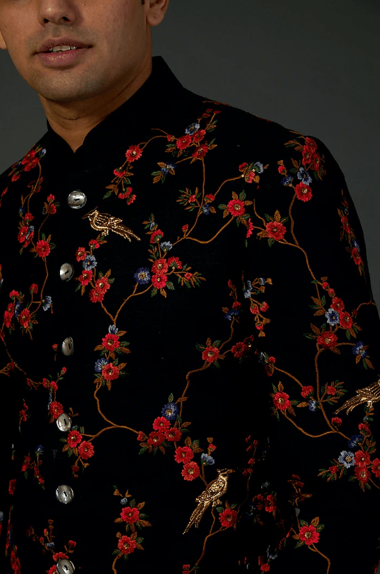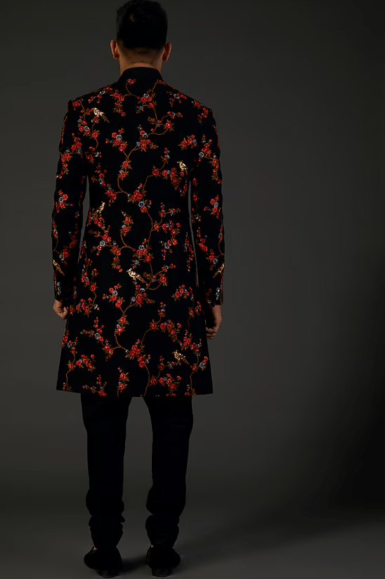 Featuring a black sherwani in matka silk base with floral machine and hand embroidery. This contains only one piece.