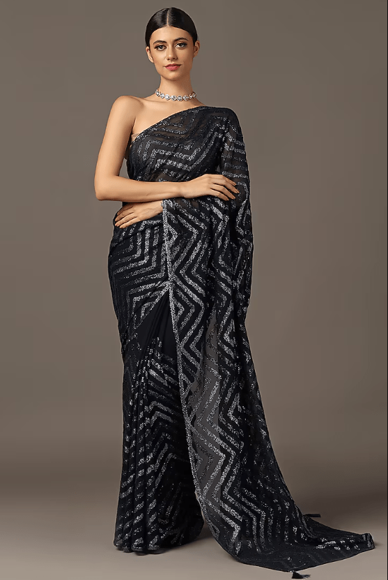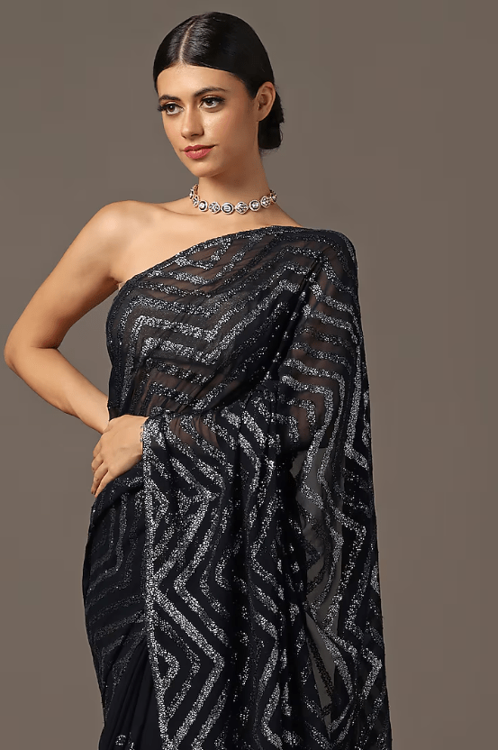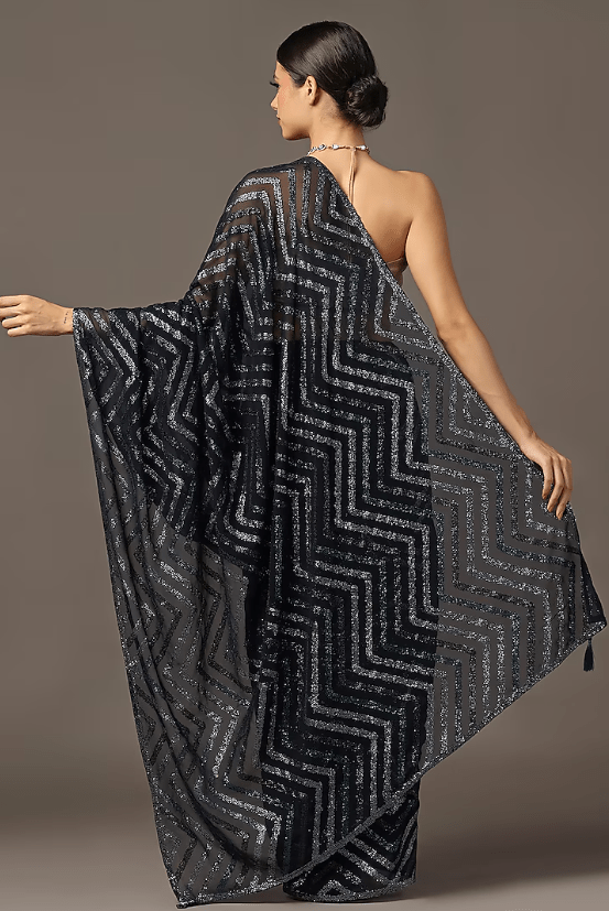 Featuring a black saree in georgette base with chevron sequins detailing. It is paired with an unstitched blouse. Accentuate it with statement earrings and heels for a festive ready-look.