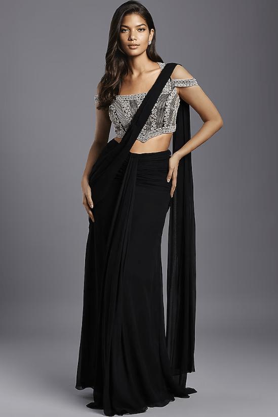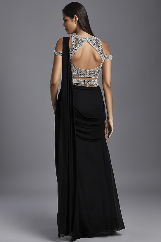 Featuring a black ruched draped saree in georgette base. It is paired with a net blouse having hand embroidery and a net belt. Accentuate it with statement earrings and heels for a wedding or sangeet ceremony.