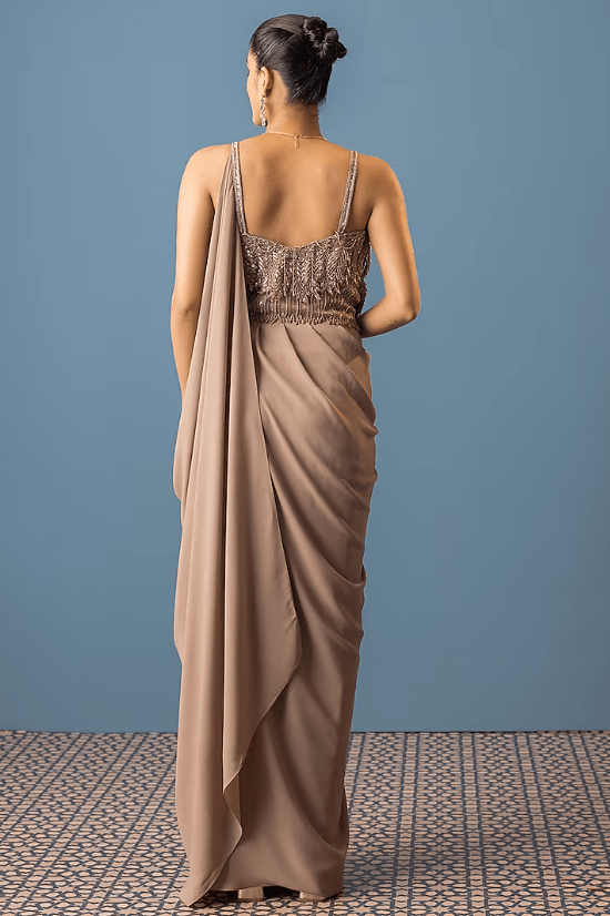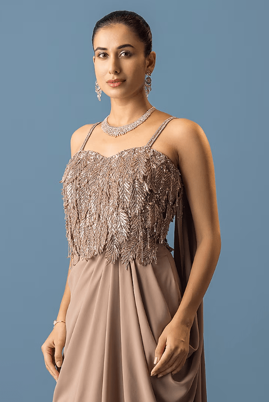 Featuring a beige draped dress in georgette and organza base with hand embroidery. Accentuate it with statement earrings and heels for sangeet ceremonies.