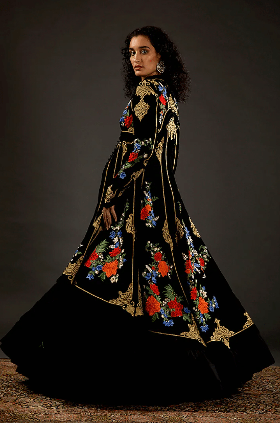 Featuring a black long jacket in silk velvet and cotton base with resham thread hand embroidery. This contains only one piece.
