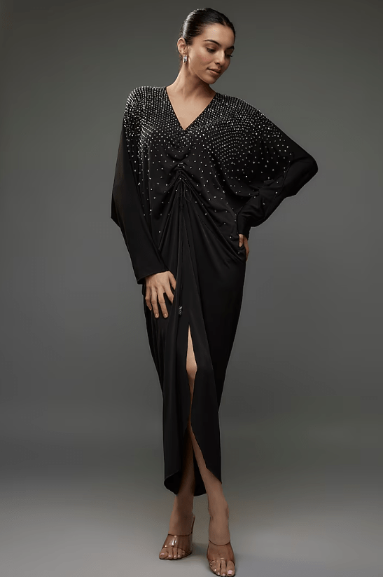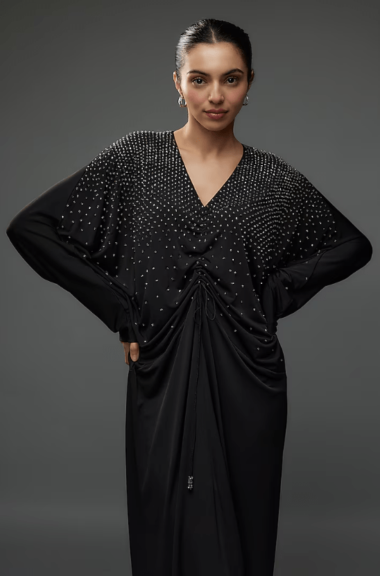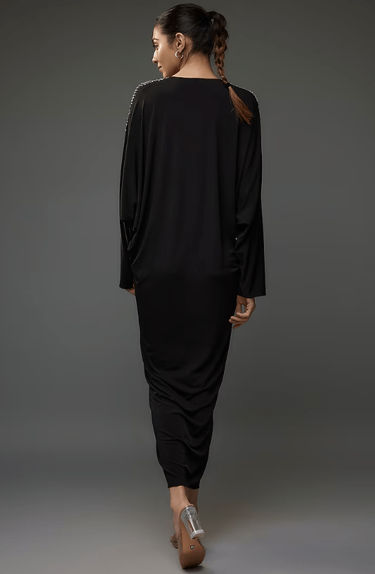 Featuring a black dress in jersey base with embroidery. Accentuate it with dangler earrings and heels for evening or party wear.