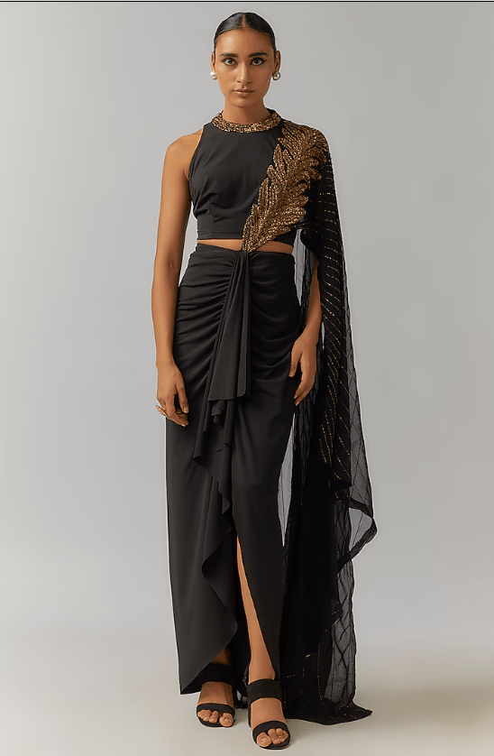 Featuring a black draped concept saree in jersey base with hand embellishments. It is paired with a blouse. Style it with statement jewellery and heels for a sangeet or engagement ceremony.