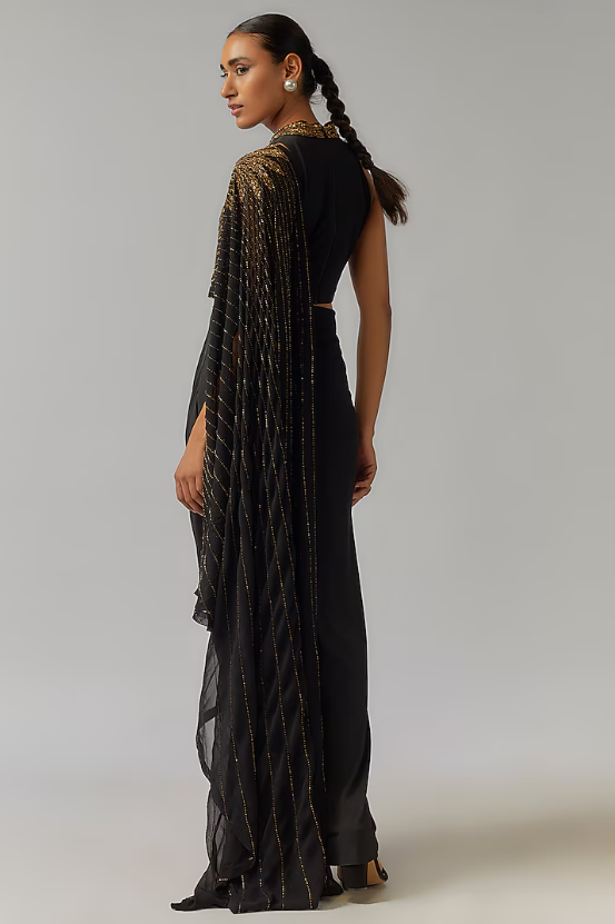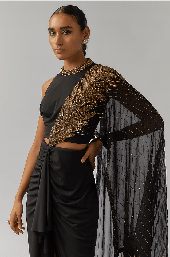 Black Jersey Hand Embellished Draped Concept Saree Set