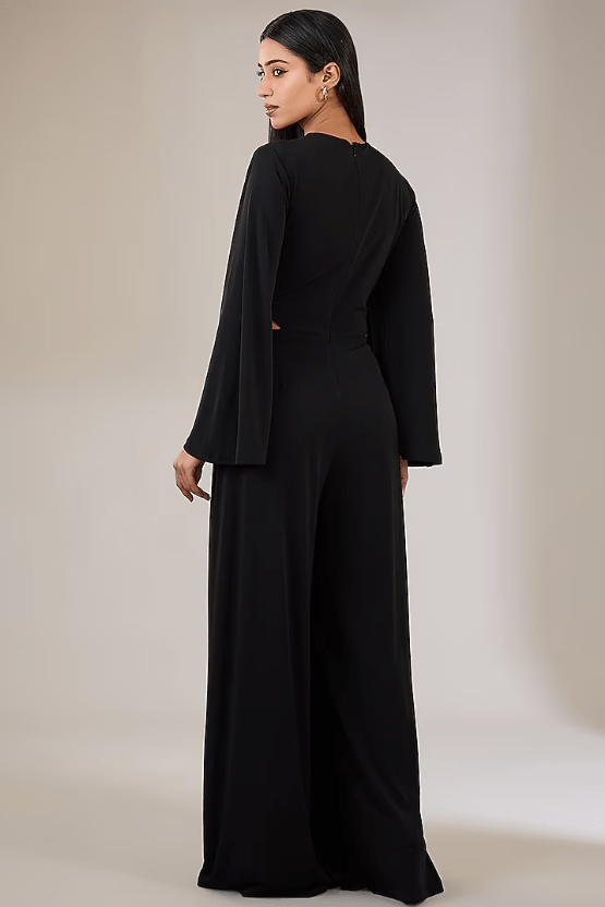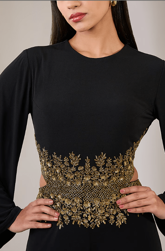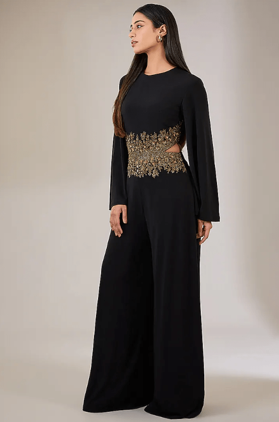 Featuring a black jumpsuit in jersey base with floral hand and machine embellishment. Accentuate with minimal jewellery and heels for an evening look.