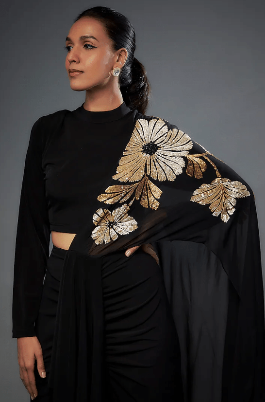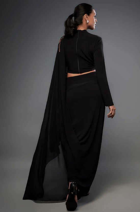 Featuring a black blouse in linen satin base with full sleeves. It is paired with a skirt having an attached embroidered drape. Perfect for evening wear or cocktail parties.