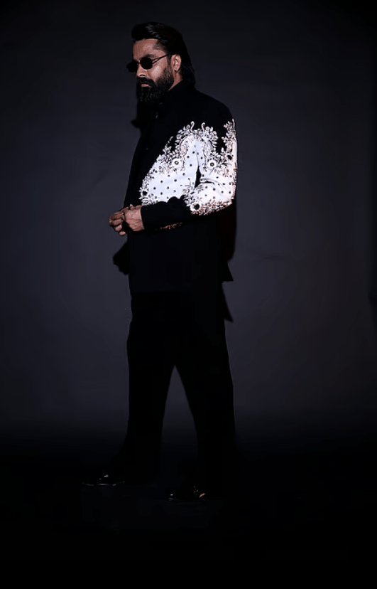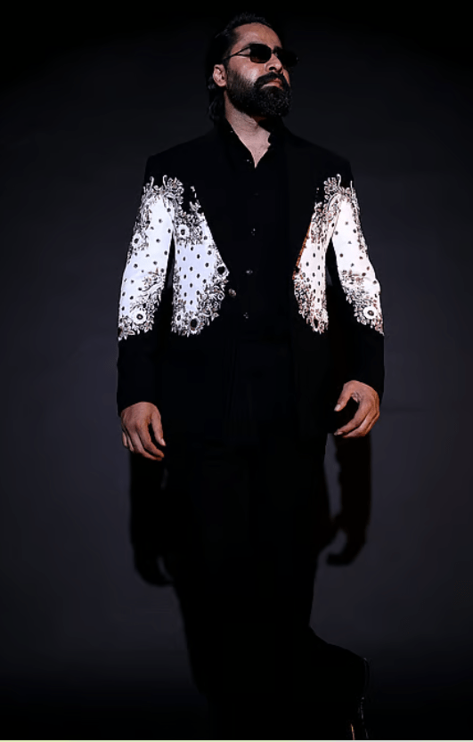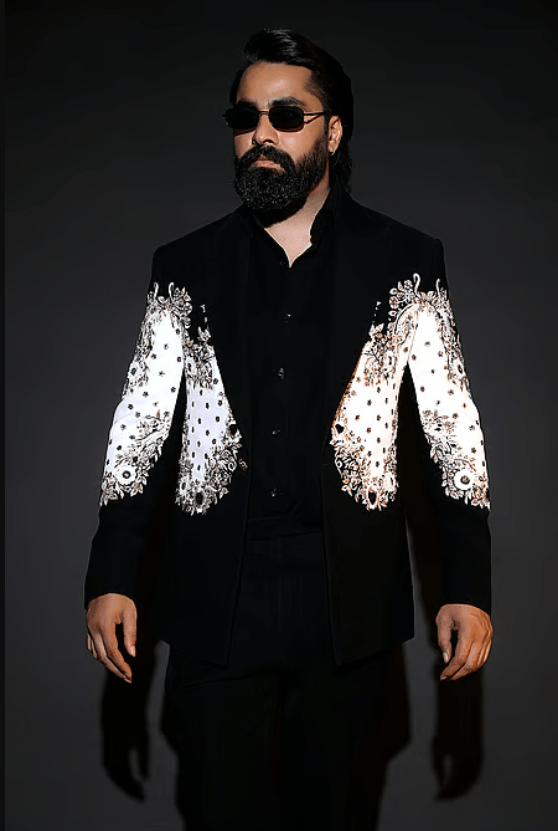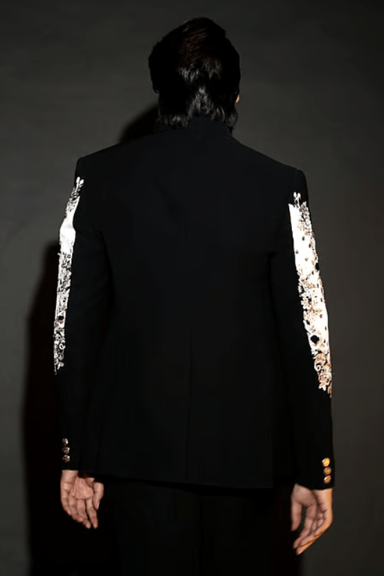 Black tuxedo set featuring a blazer, trouser, and shirt. The blazer is embellished with intricate embroidery on the sleeves.