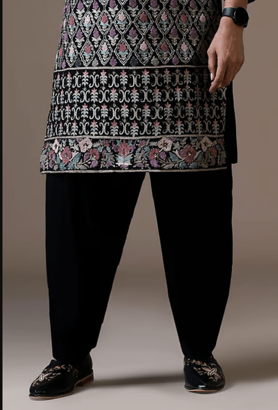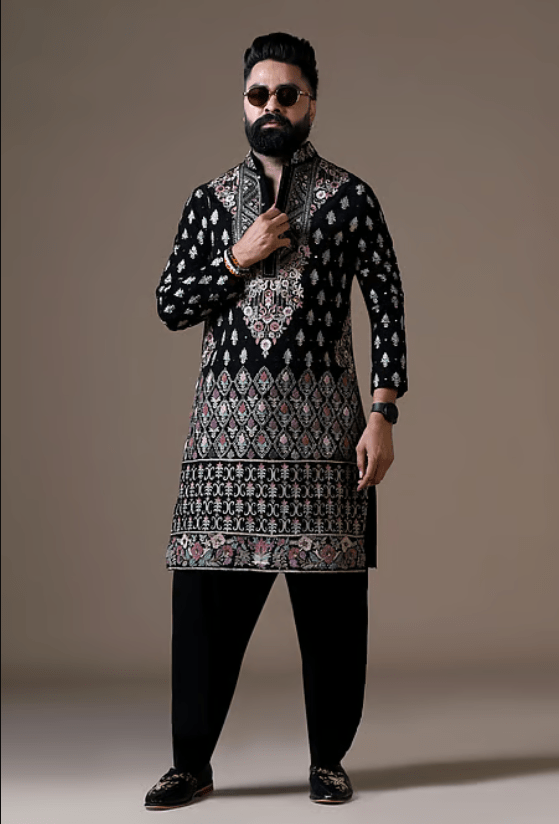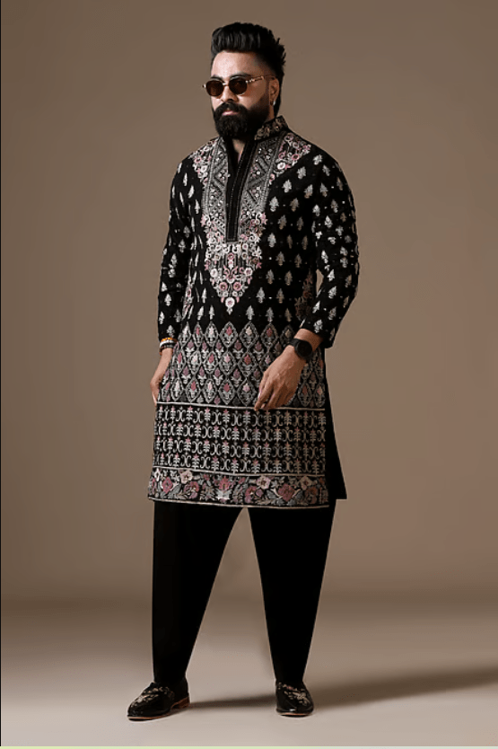 A black Japanese Lycra kurta featuring intricate knotting work, mirror accents, and fine resham embroidery. It is paired with coordinated black trousers.