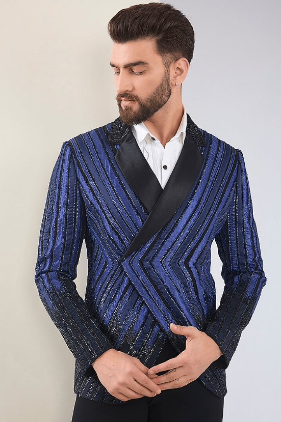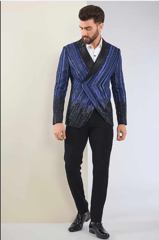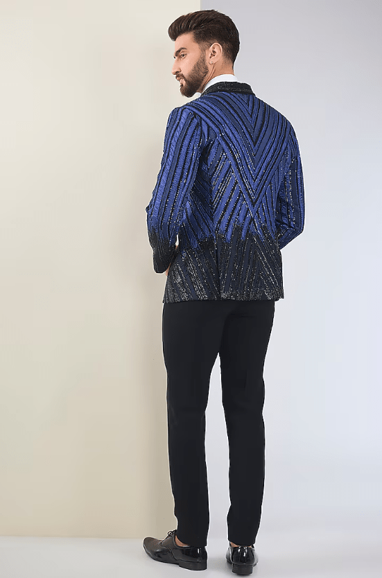 Featuring a black tuxedo in micro suiting base with hand embroidery. It is paired with pants and a shirt. Perfect for a reception or cocktail party, exuding charm and elegance.