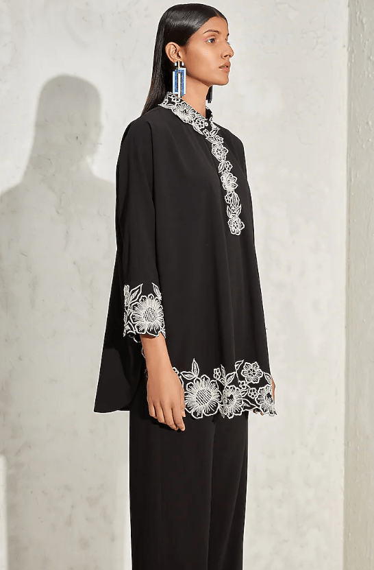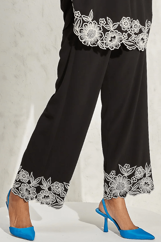 Featuring a black top in moss crepe base with floral hand and machine embellishments. It is paired with matching pants.