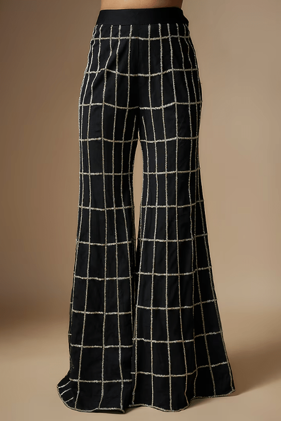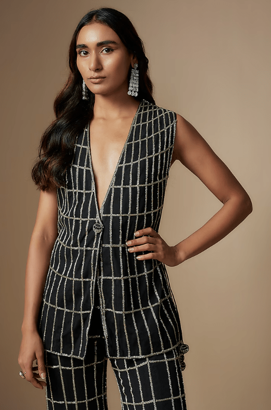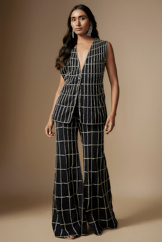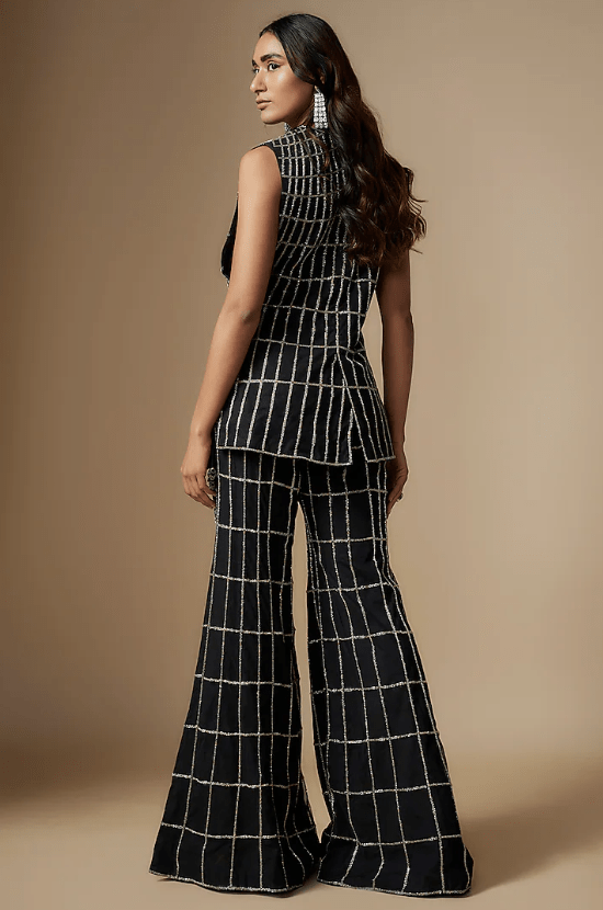 Featuring a black jacket in net base with checkered embroidery It is paired with a silk bralette and pants. Accentuate it with statement jewellery and heels for a festive occasion, sangeet or cocktail ceremony.