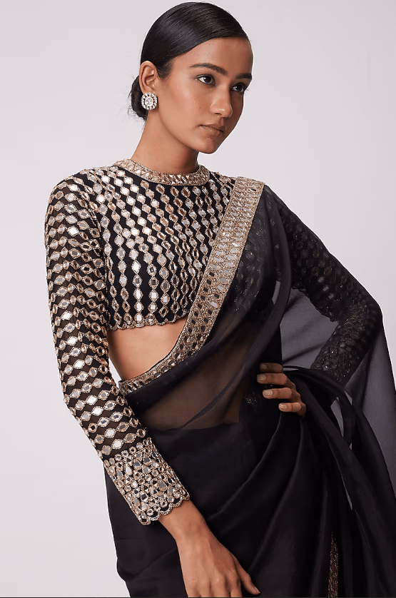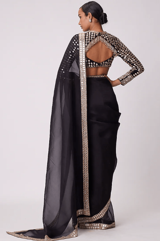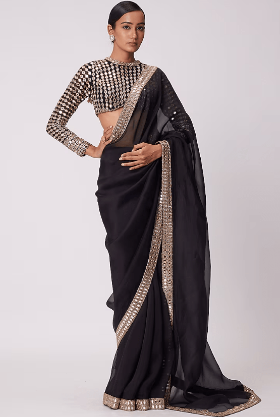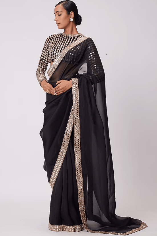 Featuring a black saree in organza base with hand embroidery. It is paired with a georgette blouse having hand cut mirror embroidery. Accentuate this statement lehenga with heels and statement jewellery for your wedding, sangeet or engagement look.