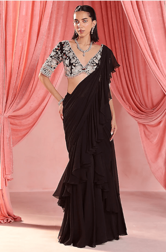 Featuring a black pre-stitched ruffle saree in organza base. It is paired with a georgette choli having sequins, glass beads, pearl, zari hand embroidery and floral applique. Accentuate with statement jewellery and heels for a wedding or festive occasion.