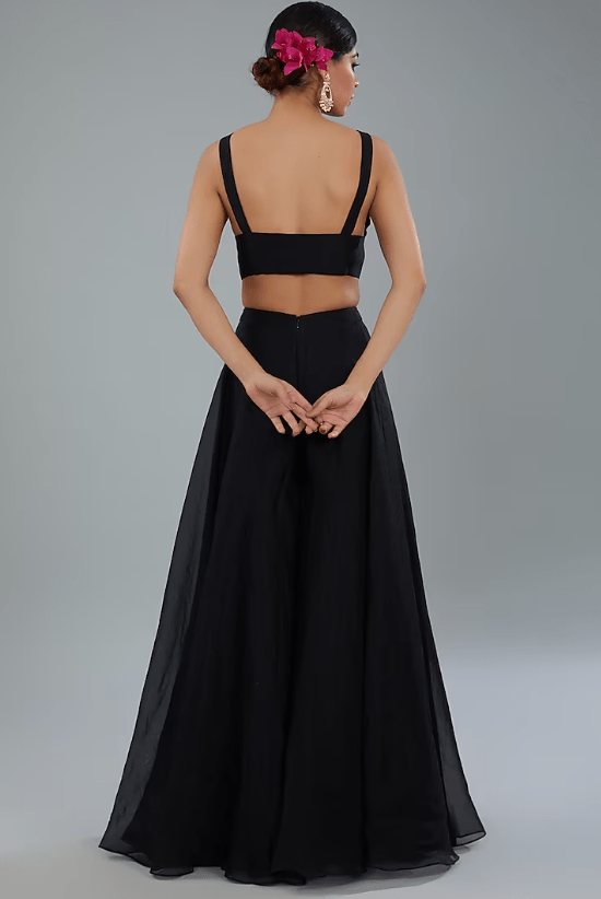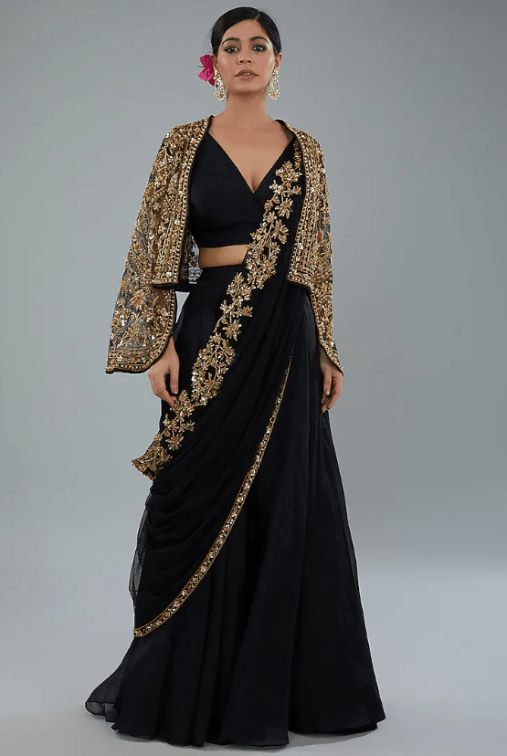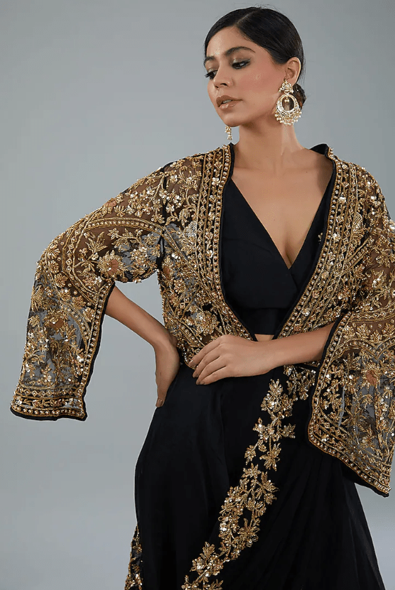 Featuring black sharara pants in organza base. It is paired with a blouse, a net-embroidered jacket and a drape. Accentuate with dangler jewellery and heels for a sangeet or engagement ceremony.