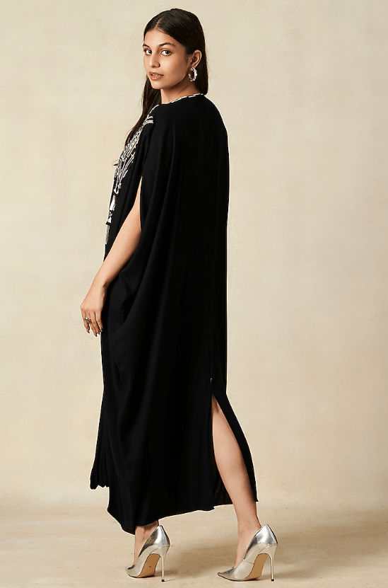 Featuring a black cowl kaftan in rayon base. Accentuate it with statement earrings and heels for a festive look.