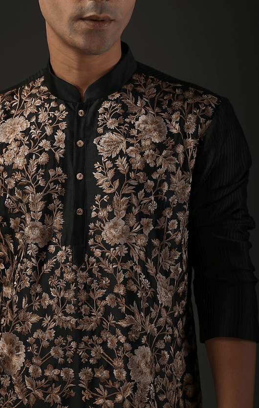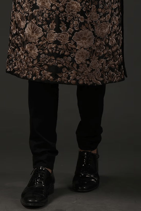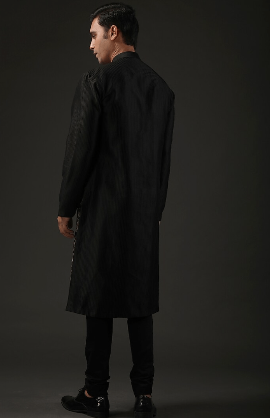 Featuring a black kurta in chanderi silk base with resham embroidery. It is paired with matching cotton solid churidar pants.
