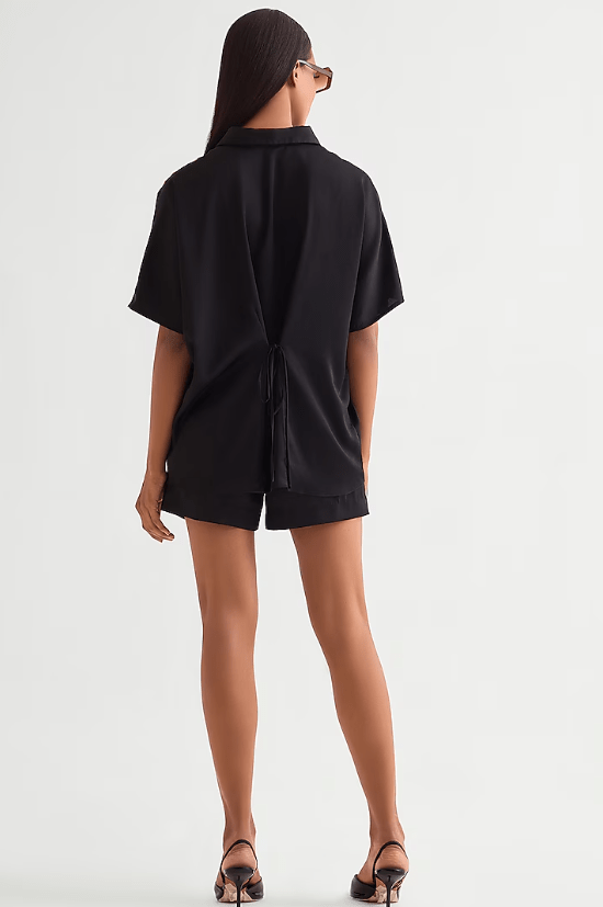Featuring a black top in satin base with zipper and back tie-up. Accentuate it with pants, stud earrings and heels a casual or evening wear.