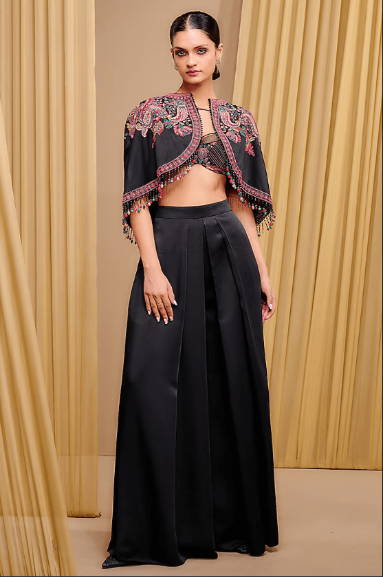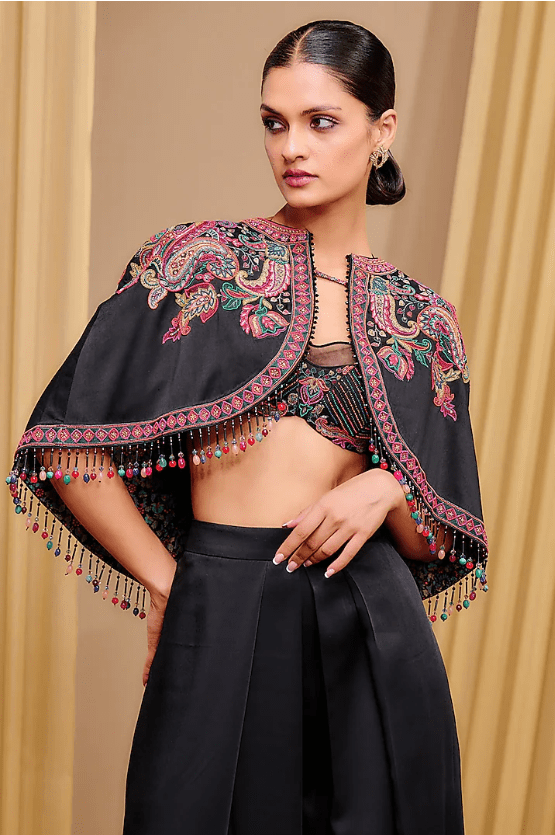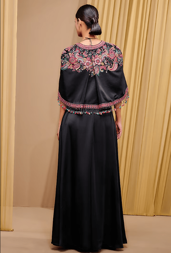 Black Cape that captivates with its elegance. The eye-catching piece is crafted in satin with multi-colored bead embroidery. Accentuate it with statement jewellery and heels for a complete look.