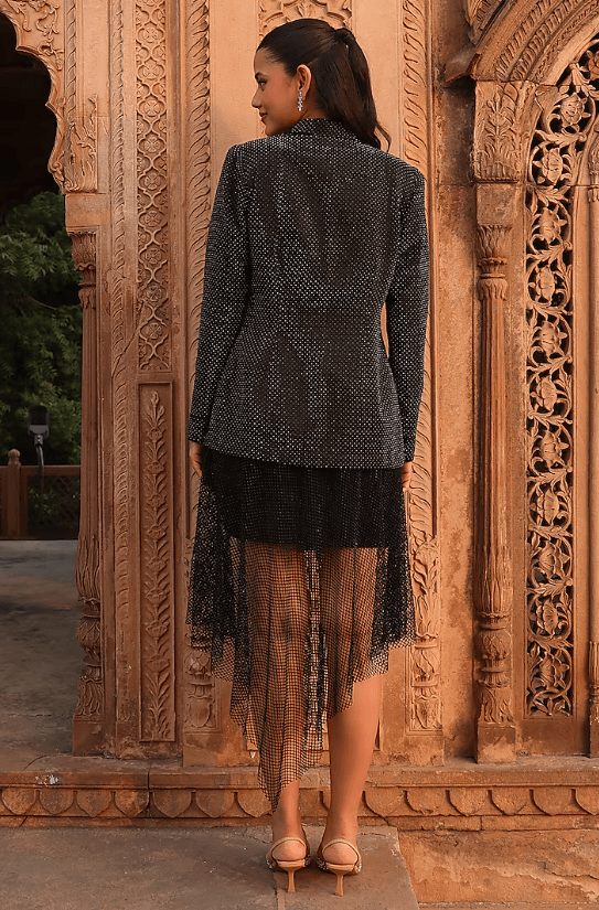 Featuring a black coat in satin base with swarovski detailing. It is paired with a net asymmetrical fish skirt. Accentuate it with stud earrings and heels for a casual yet elegant look.