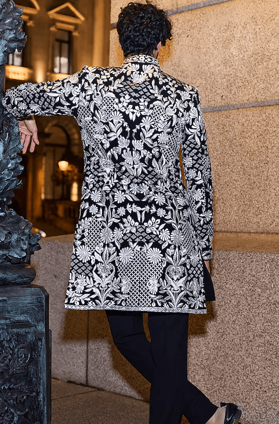 Black Sherwani Set that captivates with its elegance. This eye-catching piece is crafted in silk with black and silver thread embroidery. It is paired with a kurta and straight pants. Perfect attire for a wedding or an engagement ceremony, exuding traditional charm and elegance.