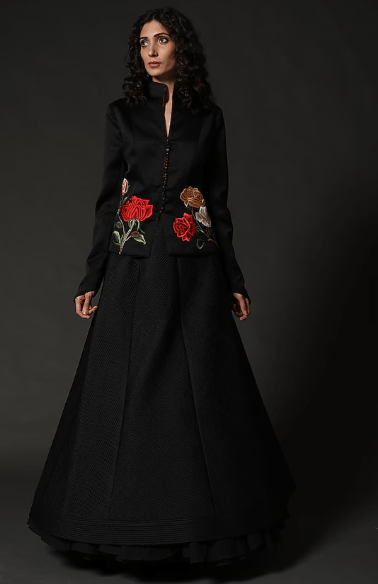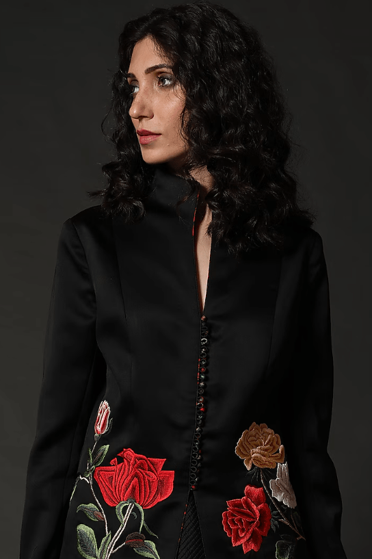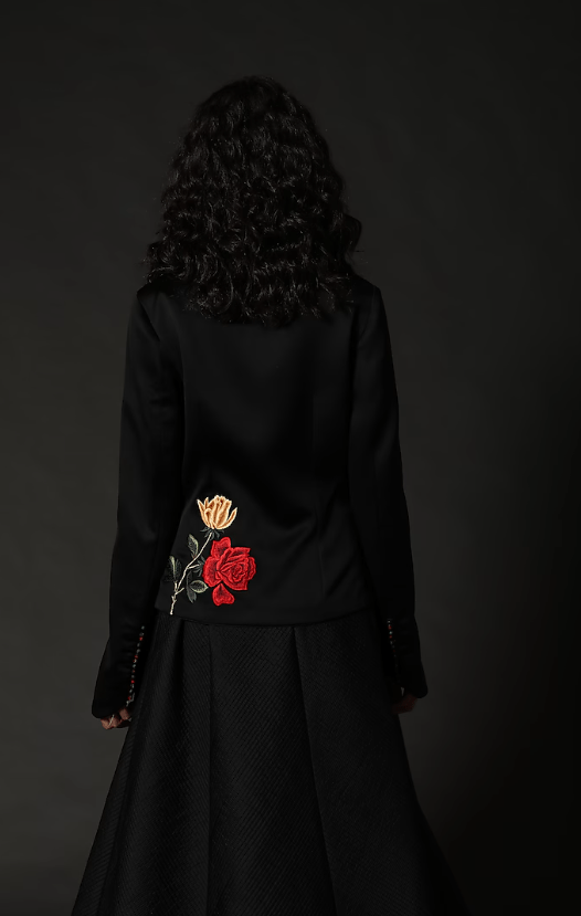 Featuring a black jacket in silk velvet base with machine embroidery. This contains only one piece.