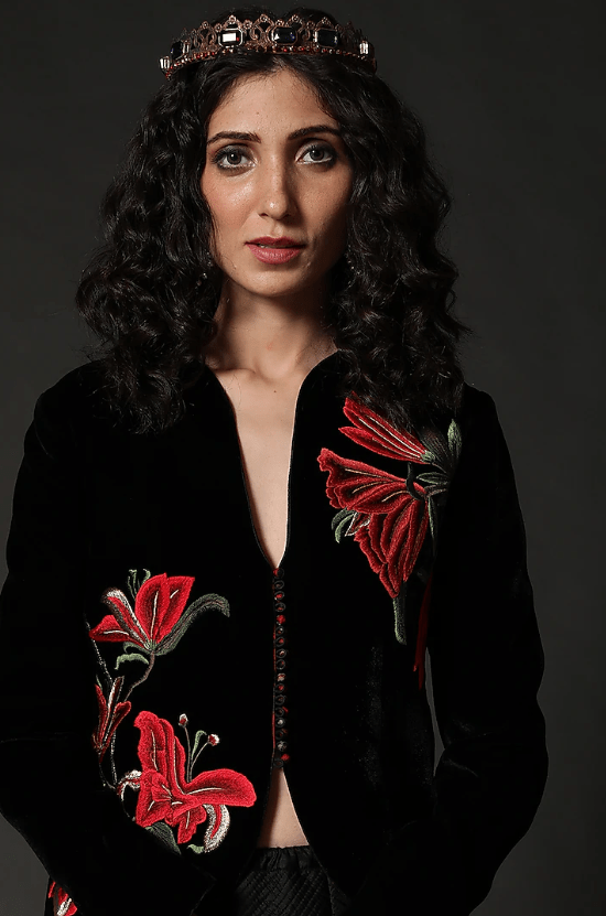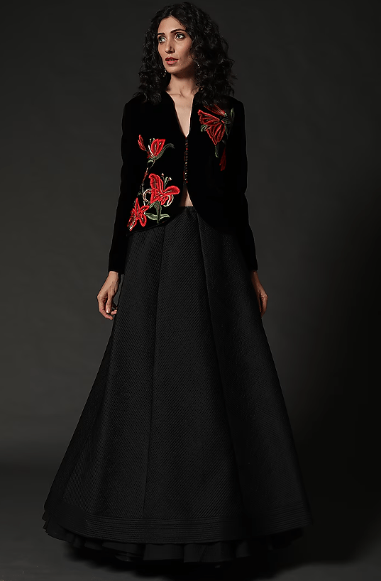 Featuring a black jacket in silk velvet base with machine embroidery. This contains only one piece.
