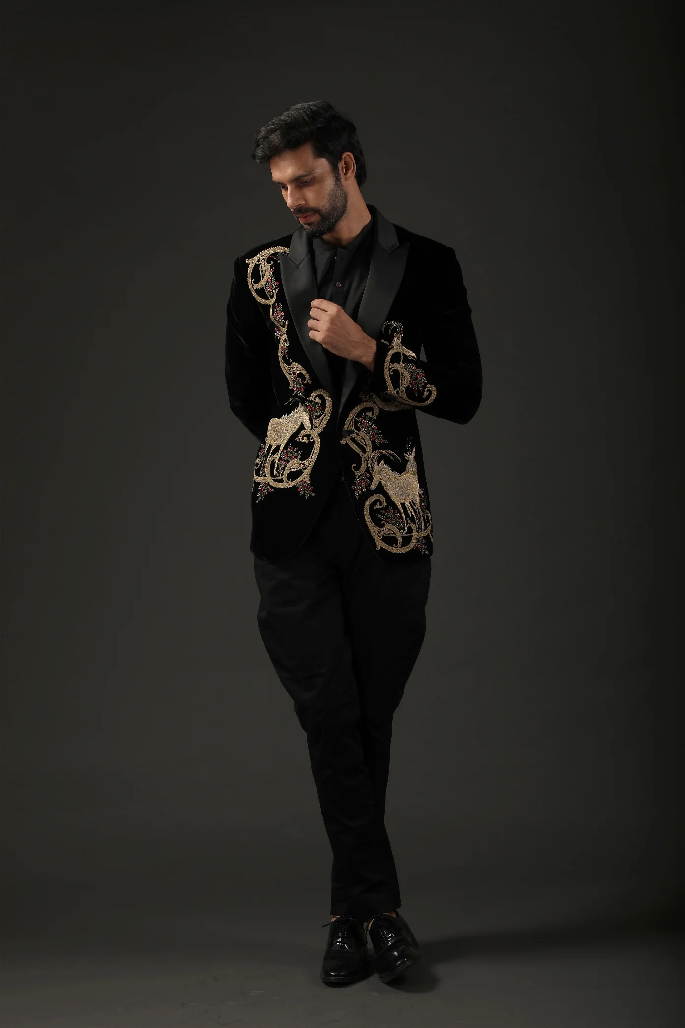 Black Silk Velvet Tuxedo With Silk Lining Has Zari And Resham Embroidery Work