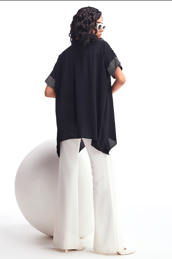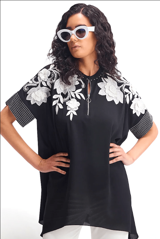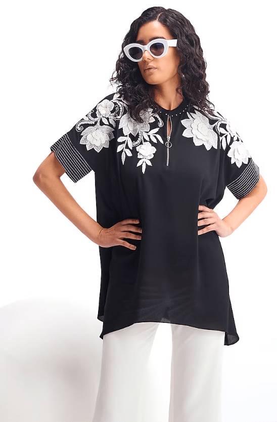 Featuring a black handkerchief tunic in textured crepe base with floral hand and machine embellishment. Team it up with pants, hoop earrings and heels for a complete look.