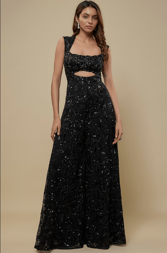 Featuring a black jumpsuit in tulle, satin organza and chinon base with embroidery. Accentuate with statement earrings and heels for evening wear or cocktail party.