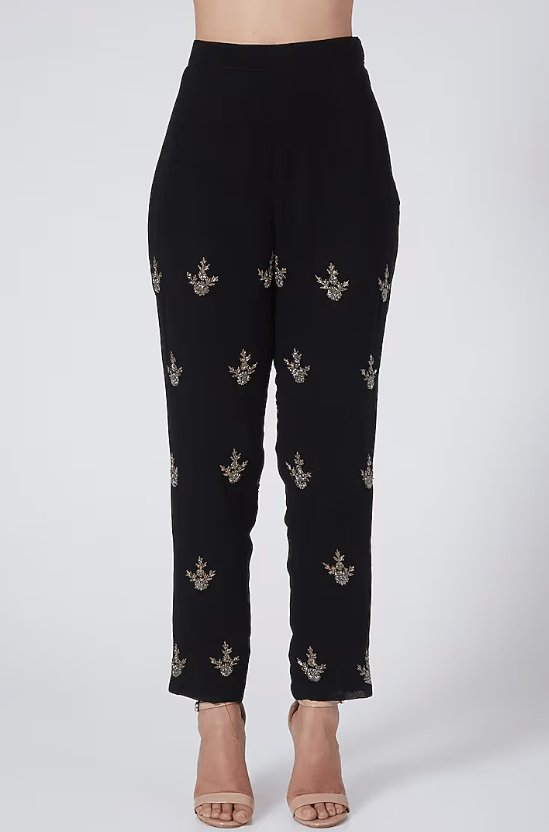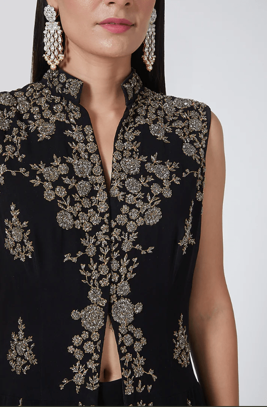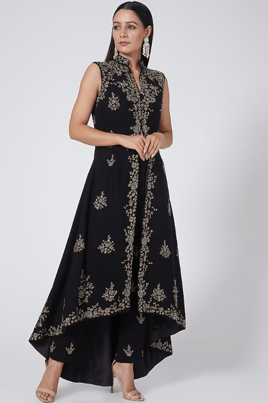 Featuring a black cape in georgette base with zardosi embroidery. It is paired with matching pants.