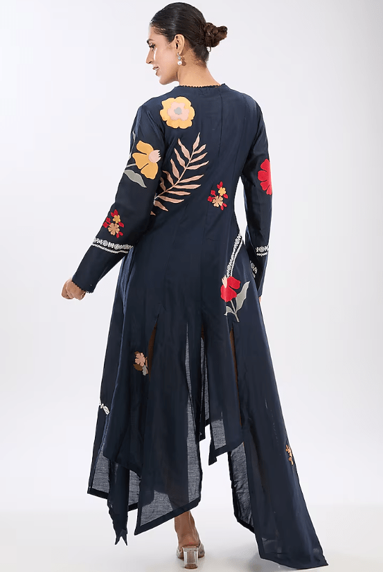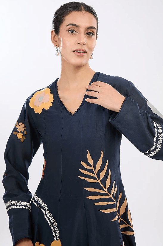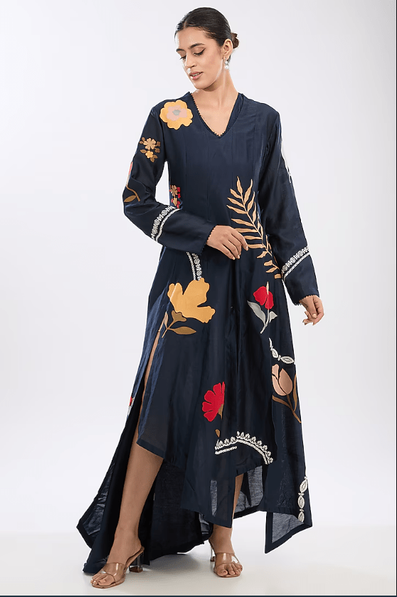 Featuring a blue paneled dress in chanderi base with floral applique embroidery. Accentuate it with statement earrings and heels for an evening look.