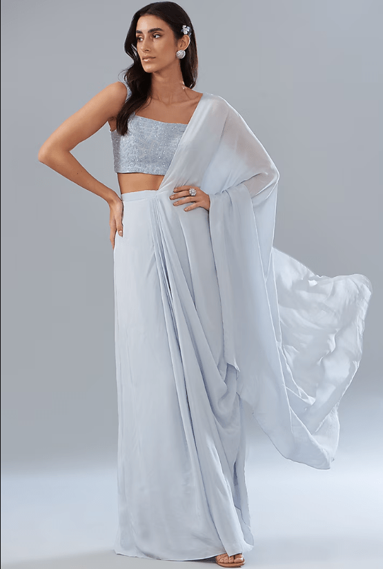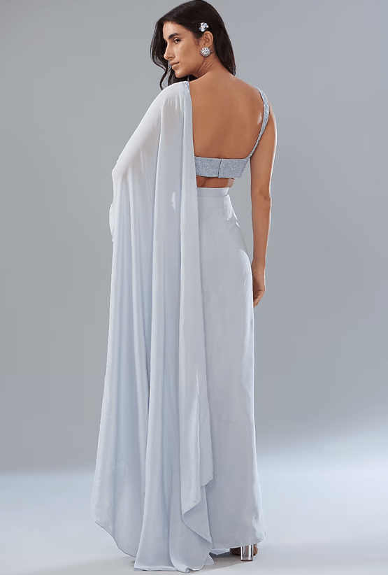 Blue Crepe Cowl Draped Saree Set