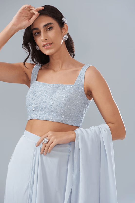 Featuring a blue cowl draped saree in crepe base. It is paired with a matching hand embroidered blouse.