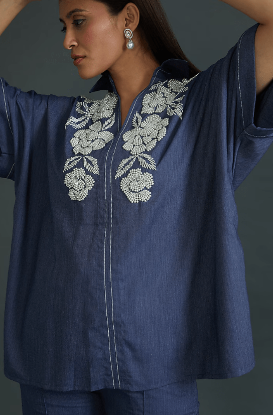 Featuring a blue tunic in denim base with pearl and floral embroidery. It is paired with matching pants.